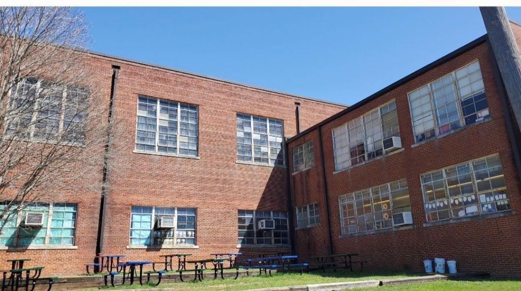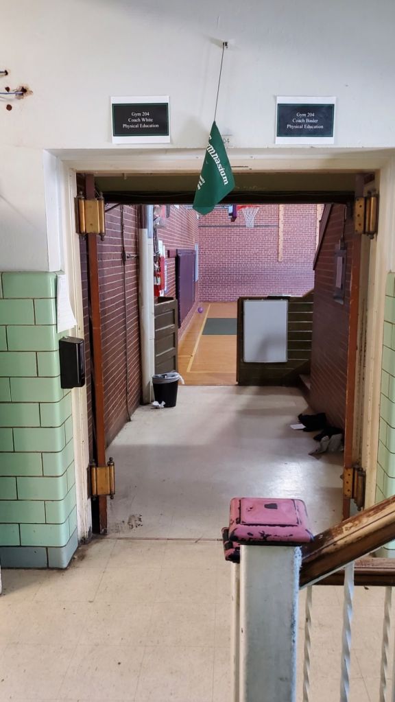 This past week, Mrs. Hoover & others came to mind as I got numerous messages that the place where I met Mrs. Hoover & the others was circled by demolition fencing & heavy equipment. I visited post dinner on Friday for a last look & took some photos, one of the windows of the old “libary” & another of the gaping hole that used to be a window by where I sat in the 6th grade.