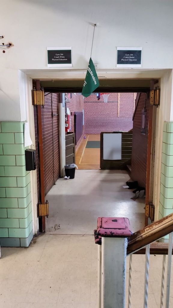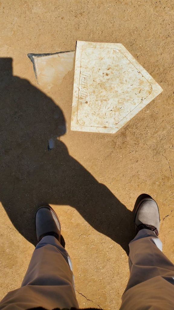 outranks me as I became a former starter turned 6th or 7th man because the team was better that way, because you never give up on your team on or off the floor & on the floor, you never give up the baseline. Out the other half door with a quick glance to where my dad sat every game. Every. Game. The glance became a journey into the bleachers & my seat plopping into his with much more gratitude than I possessed years ago. Back down the steps, a left turn & up an incline of 4 or 5 paces & on the left, the locker room. In its tight confines I learned that jersey color is more important than skin color. A last exit out the double doors & the deluge was forming in my eyes. A last walk of the 45 degree angle from gym to English class, a last view down the hall to the auditorium & picture window, & a final peek up & down the main staircase, a final handspin on the newel post & trip down the 5 treads to the back door & a concrete landing where Bruce & I waited on a post practice pickup by one of our parents. Down the steps where shoes were put on & tied before practice & untied & removed before climbing the steps after practice. Then onto the parking lot, hearing in my head the rhythmic click-clack of football cleats & the crunch that baseball spikes added as a coda to the click-clack as metal met asphalt. Around the drive that leads to the baseball field, a look toward the train tracks as a bush grows where an old wooden bleacher of 2×12s once sat as a sentinel for a football field where five touchdowns with my name on them lived long ago. With the diamond below me, off to the left, the most important triangle, save the Holy Trinity, in my life. The adjacent side formed by Coach Moser’s room on top & Mrs. Farrow’s on the bottom & the opposite side by the cafeteria under the gym, forming the points for the hypotenuse of my days. Down to the diamond & a promise to a friend now halfway around the world. A promise kept at a place where we were much closer, the 90 feet between first & second base. I also fielded an imaginary grounder & completed the 4-3 putout to honor our season as the right side of the All City infield, documented somewhere by an old photo with adhesive tape patina in a scrapbook. I was the pivot man on an imagined 5-4-3 twin killing as my main sidekick was in that yellowed photo as the year’s All City third baseman. I made my way to the batters box & took my stance in sight of a metal A-frame awning that has overlooked the field since 1977. An awning my dad & other boosters used as a concession stand to help pay for athletics. Back up the hill, by the side door & steps & around to the front steps to see classmates for the “it was good to see you”, & it was, before the goodbyes. And it was time to go, the once new, now old, always my school in my rear view mirror, the deluge releasing in my eyes, not because a time & place had vanished but because it had occurred, & my off key rendition of the alma mater in my lungs: